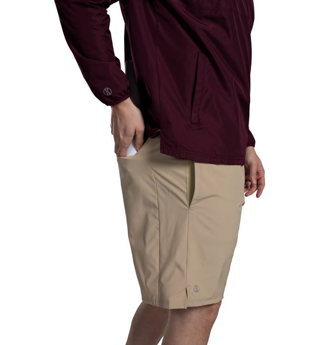 * 90% polyester/10% spandex * 4-way stretch woven fabric allows for increased mobility * Dry-Excel(tm) 100% polyester pinhole micromesh inseam gusset * Tag-free label * Covered elastic waistband with inside drawcord * Side seam pockets * Back zippered pocket * 8.5-inch inseam* Water-repellent